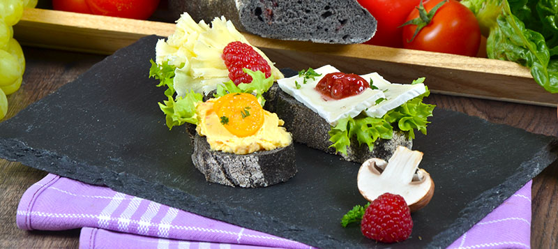 Schwarzes Cranberry-Baguette* auf knackigem Salat belegt mit: St. Andre Camembert mit hausgemachtem