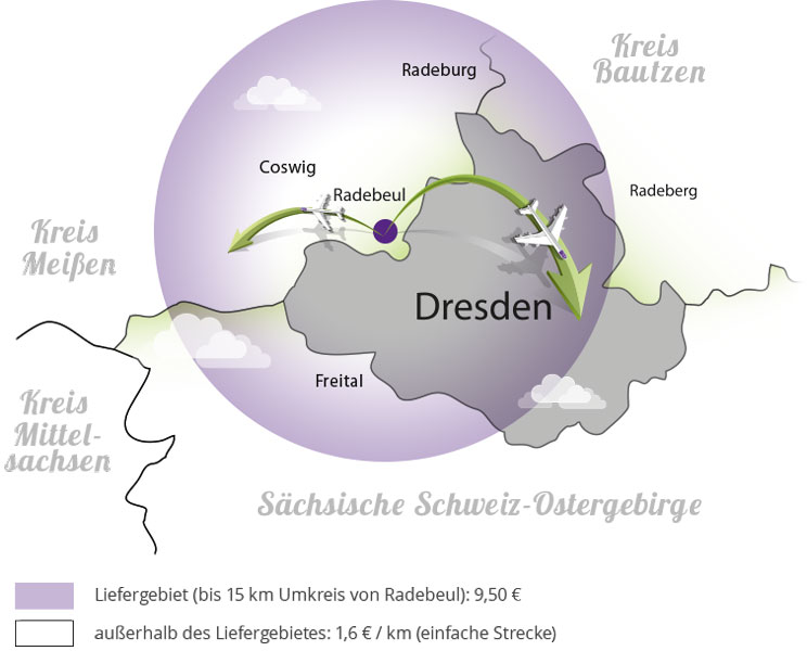 Das direkte Liefergebiet unserer Foodlinie erstreckt sich 15km im Radius um Radebeul. Natürlich liefern wir auch außerhalb dieses Liefergebietes: hierfür berechnen wir ab dem 16. Kilometer 2 € (netto) / km. Sie können bequem über unseren Onlineshop bestellen und im Bestellprozess Ihren gewünschten Lieferort eingeben. Hier wird Ihnen die genaue Lieferpauschale berechnet, wenn sie außerhalb des Liefergebietes liegt.